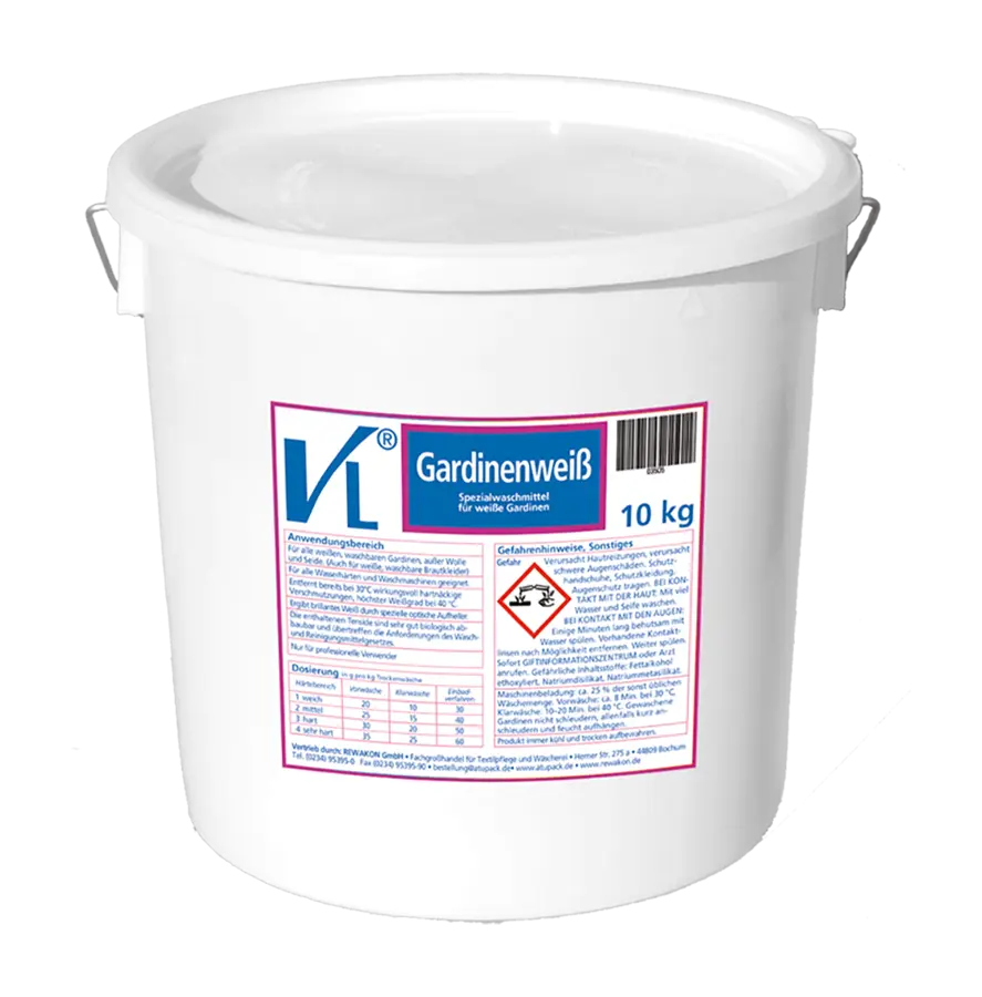 Beschreibung: VL-Gardinenweiß, 10 kg Eimer Spezialwaschmittel für weiße Gardinen