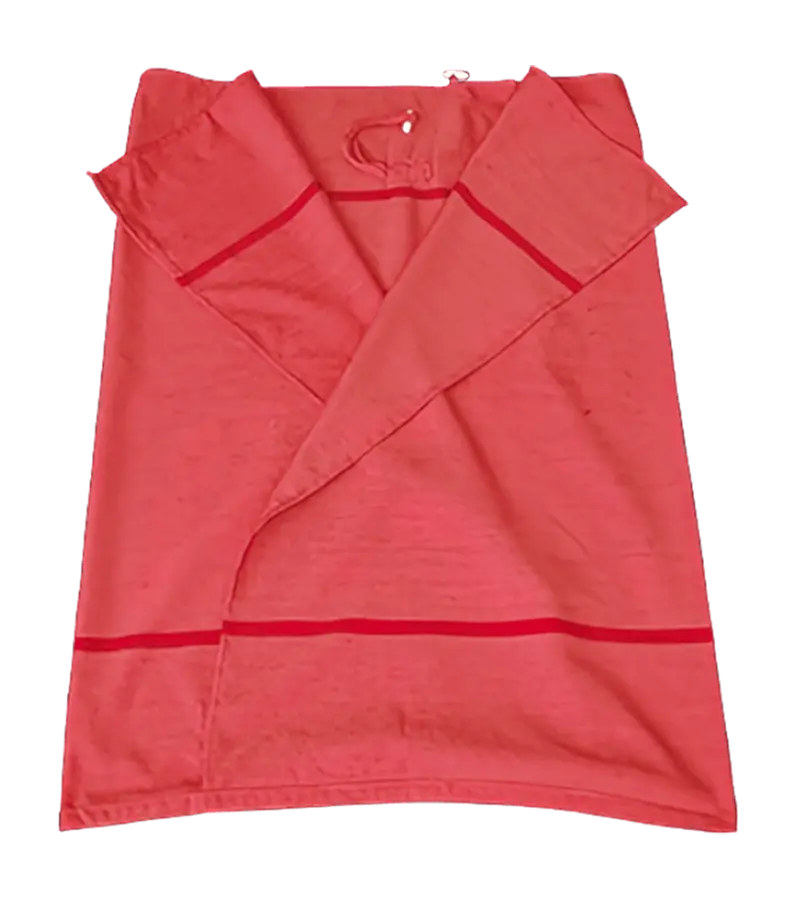 Beschreibung: PES Wäschesack, weiß mit 2 roten Kennstreifen 103x58cm mit Knebelverschluß, 3-Bahnen-Zuschnitt,-Schnitt gerade-
