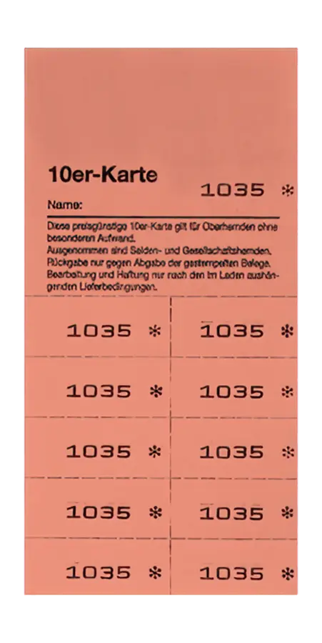 Bei Karten mit 10 Etiketten werden die Abrisse als Wertmarke benutzt. D.h.: Der Kunde legt die Zehnerkarte bei Abgabe der Kleidung vor, die entsprechende Anzahl Wertmarken wird von der Zehnerkarte abgetrennt und entwertet. Die Teile werden mit 0,00€ in der Kasse erfasst bzw. es wird vom normalen Annahmeblock ein Auftrag ausgestellt, um Kennzeichnungsetiketten