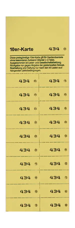 Zehnerkarten mit 20 Etiketten werden so gehandhabt, dass der linke Abschnitt mittels eines Stempels entwertet wird (wird nicht abgetrennt), und der dazu gehörige rechte Abschnitt wird zur Kennzeichnung des Kleidungsstückes verwendet. Bei der Abholung gelten die gestempelten Abschnitte als Abholausweis und werden dem Kunden abgenommen und vernichtet.